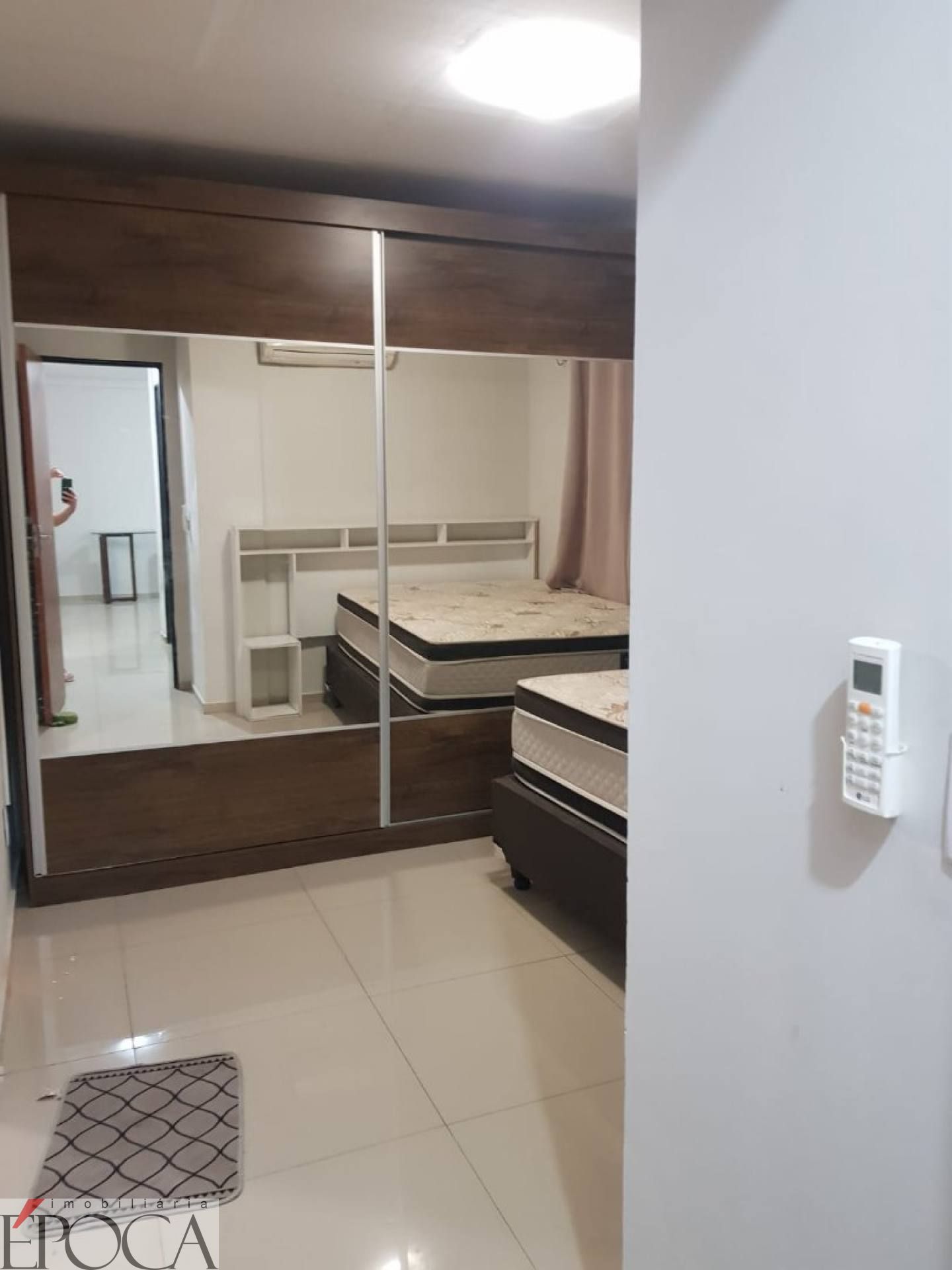 1° quarto suíte - cama box casal com cabeceira, cortina, ar-condicionado, guarda-roupa espelhado, banheiro completo com box blindex e armário.